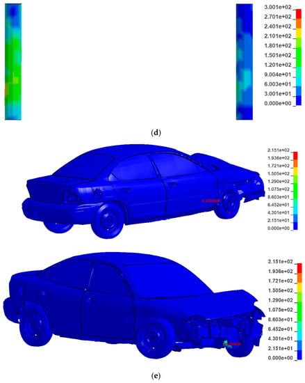 The car stress cloud diagram is shown in Figure 13e. The maximum stress is 215.1 MPa, and the maximum stress unit is 2,303,801 units. It is located at the junction of the bumper and the car body. It does not reach the yield stress of the vehicle material, so the car deforms greatly without damage and in a safe state.