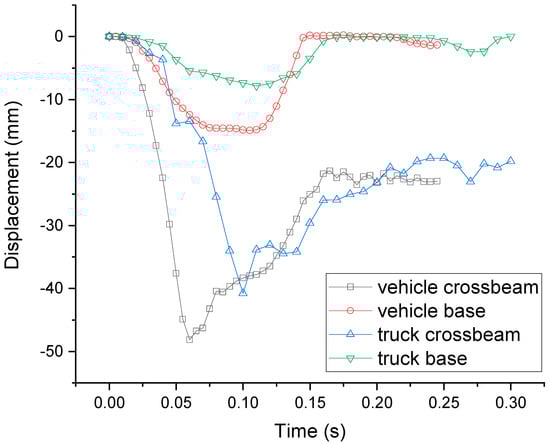 The lateral displacement of the guardrail is an important indicator of guardrail and vehicle safety. Taking the maximum displacement node in the guardrail beam displacement cloud map and a node of the maximum displacement base of the guardrail, the curve of the lateral displacement of the guardrail beam over time is drawn as shown in Figure 14. The maximum displacement of the saddle-shaped base of the vehicle collision guardrail is 15 mm while the maximum displacement of the guardrail beam is 49 mm and the maximum deformation of the guardrail beam is 34 mm. The maximum displacement of the saddle-shaped base of a truck is 8 mm, while the maximum displacement of the guardrail beam is 41 mm and the maximum deformation of the guardrail beam is 33 mm. They all meet the guardrail of the bridge’s maximum lateral dynamic deformation value of 0.3–0.6 m in the design code of highway traffic safety facility requirements.