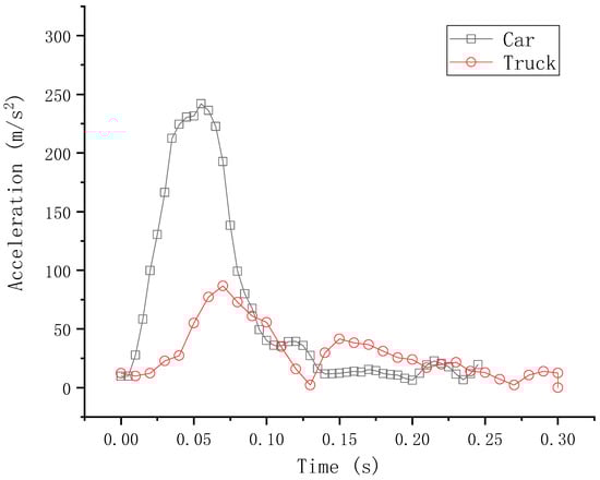 Vehicle acceleration is an important parameter of evaluating the survivability of passengers. Since the acceleration of each point on the car body is not same, we chose the engine of cars and trucks to draw the acceleration–time curve. Figure 15 shows the acceleration–time curve of cars and trucks. The acceleration of a car is generally less than 200 m/s2, but some exceed 200 m/s2. The peak acceleration of the truck is 87 m/s2, much smaller than the peak acceleration of a car as the initial speed of the truck is 60 km/h, much smaller than that of the car (100 km/h). This shows that the guardrail is well-oriented and that the passengers are relatively uninjured.