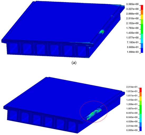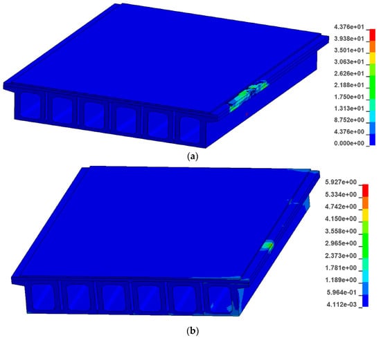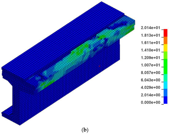 In order to study the damage caused by the collision between the car and the guardrail to the bridge, the ultimate stress failure of concrete and steel is defined in LS-DYNA. It can be seen from the collision force–time curve that the collision force is the largest at 0.04 s. Figure 17 shows the maximum tensile stress diagram of the fabricated guardrail and the traditional guardrail at 0.04 s; Figure 18 shows the V-M stress diagram of the fabricated guardrail and the traditional guardrail at 0.04 s.