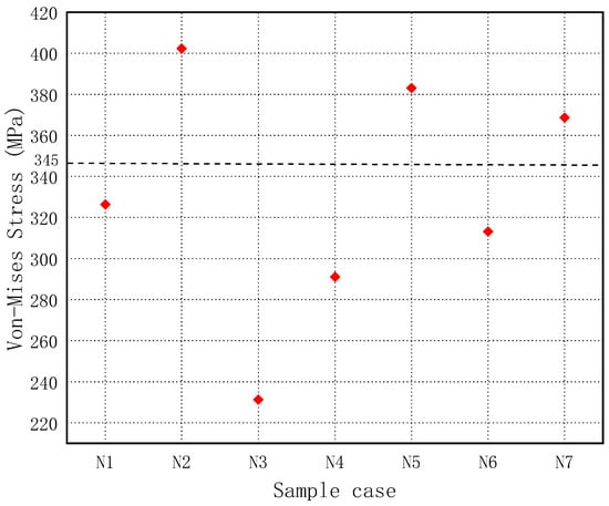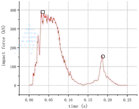 The time–impact force relationship of the assembled bridge guardrail in a vehicle collision is shown in Figure 19. The peak dynamic force (PDF) was investigated. The first peak force appears when the front of the vehicle collides with the guardrail. The second peak force on the guardrail is caused by the collision between the car’s rear and the guardrail. Each sample reaches its PDF almost at the same time (32–50 ms), and the impact force is 0 after 230 ms. Samples N3 and N7 only have one peak force each as the initial speed of sample N3 is small and the rear of the vehicle moved away without crashing into the guardrail. Since the collision angle of sample N7 is small and the vehicle turns easily, the rear of the vehicle does not collide with the guardrail. Table A8 in the Appendix A summarizes the PDF and the maximum deformation of the guardrail beam of all samples. The maximum deformation of the guardrail beam is 73 mm. According to the literature [], the transverse deformation Z of the bridge beam–column steel guardrail ranges from 0.3 m to 0.6 m, which meet the requirements.