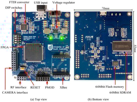 The various IO headers supported by the sensor node are labelled in Figure 2. The Reset button at the bottom-left corner of Figure 2a allows manual reconfiguration of the FPGA using the bitstream stored in the Flash memory. The four DIP switches on the left-hand side are used for user input. Headers are included for connecting cameras (far left of Figure 2a) and PMOD devices (bottom of Figure 2a). PMOD is an interface standard defined by Digilent []. This interface was selected because over 60 I/O and sensor boards are available from Digilent, ranging from GPS receivers and Wi-Fi modules to motor drivers and temperature sensors []. Two other headers shown in Figure 2, namely, the RF Transceiver and XBee Pro, are described later.