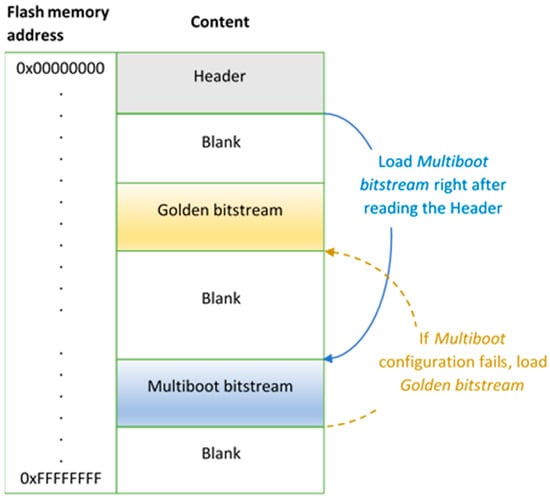 The Spartan 6 family of FPGAs can also be programmed using a feature called Multiboot. It allows the FPGA to selectively reload and reprogram its bitstream from the external Flash memory []. Multiboot operations can be controlled by interacting with the configuration logic of the FPGA using the internal configuration access port (ICAP). The ICAP can be accessed from a user’s configuration by including the ICAP_SPARTAN6 primitive into the configuration design. There are four registers within the configuration logic. These registers are used to store the memory address of the bitstreams that are to be loaded to configure the FPGA. These registers can be set through the ICAP or through a short header bitstream located at address 0x00000000 of the external memory. The GENERAL1 and GENERAL2 registers are used to store the address of the Multiboot bitstream that the user wishes to load. The GENERAL3 and GENERAL4 registers are used to store a fallback address where a “Golden” bitstream is stored, as shown in Figure 3. This Golden bitstream is known to be safe and is usually located in a protected area of the flash memory. Once the bitstream addresses have been set in the registers, the ICAP is used to issue an IPROG command []. This has an effect similar to manually resetting the FPGA except the Multiboot logic is not affected, allowing the contents of the registers to be used to set the address from which to load the bitstream. Further details of the Spartan 6 FPGA configuration process can be found in [].
