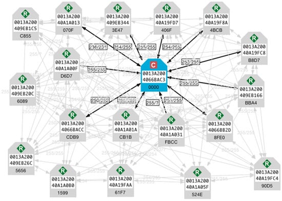 Figure 4 shows a schematic view of the network, where a central coordinating station called gateway provides access to the Internet. The blue node in the middle (marked ‘C’) indicates the coordinator XBee device connected to the gateway. The dark arrows indicate the direct connections to the coordinator and the light arrows show the mesh connections between the remaining nodes.