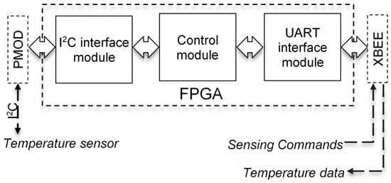 Figure 5 shows the block diagram of the digital logic system developed for temperature sensing with I2C interface. In Figure 5, a PmodTMP3 module from Digilent [] was attached to the PMOD port of the sensor node. A temperature sensor that has a SPI interface instead, such as the PmodGYRO module from Digilent [], can also be connected to the PMOD port in Figure 5. Of course, this will require the relevant SPI logic to be programmed into the FPGA. The PmodGYRO module can provide 3-axis gyroscope data as well as temperature.