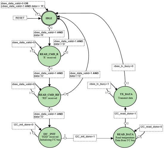 The Control Module shown in Figure 5 is a state machine designed to accomplish the following tasks: (1) send necessary commands and initialize the temperature sensor; (2) receive sensed data from the sensor via the relevant interface (I2C or SPI); (3) make all sensed data available at its outputs so that the data can be transmitted over the network. The state machine developed to implement the I2C temperature sensing system is shown in Figure 6. It comprises of 6 states: IDLE, READ_CMD_R, READ_CMD_RD, I2C_INIT, READ_DATA, and TX_DATA.