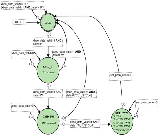 Figure 7 shows the block diagram of the scheme developed for the PWM fan control application. In general, the state machine for PWM fan control is similar to that for temperature sensing presented in the previous section. It comprises of 4 states: IDLE, CMD_P, CMD_PW, and SET_PWM. In IDLE state, the control block waits for the command from the network, which is the ASCII sequence of “PW0” to “PW4”, where “PW0” is to turn off the PWM fan and “PW4” is to turn the PWM fan full on. “PW1”, “PW2”, and “PW3” commands are used to control the PWM fan speed at 25%, 50%, and 75%, respectively. The state machine developed for the PWM fan control is shown in Figure 8.