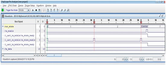 The real-time state transitions of the FSMs implemented on the FPGA were monitored using the Xilinx ChipScope tool. The captured waveforms for the temperature-sensing application are shown in Figure 9. It shows all the states of the FSM (cur_state) during temperature sensing and during transmission of the sensed data. The transmitted temperature data are also shown (tx_data).