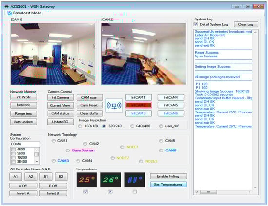 Figure 10 shows the GUI developed for various sensing and control applications as well as image-processing applications. Compressed images received from two different camera nodes over the network are depicted within Figure 10. The two images depicted have two different resolutions that are selected from within the GUI. The control switches and sensed temperatures can be seen at the bottom part of Figure 10.