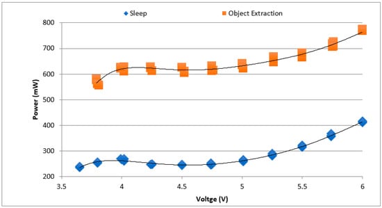 The power consumed by the sensor node was measured with an object extraction architecture programmed into the FPGA. Figure 11 shows the experimental results on the power consumed by the sensor node at various supply voltages. At 5 V supply, the power consumed by the object extraction architecture is 620 mW. When the FPGA is put to sleep mode, the power consumption reduces significantly, consuming only 250 mW at 5 V.