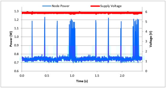 For a more comprehensive view of the performance during the combined image-processing operation, in Figure 14, we have captured the power consumption for an entire image processing and transmission cycle. In this example, the time taken for the entire processing and transmission operation is approximately 7 s. This is likely to vary depending on the nature and size of the extracted object (image) as well as the network configuration and prevailing network conditions (noise levels, number of hops, etc.).