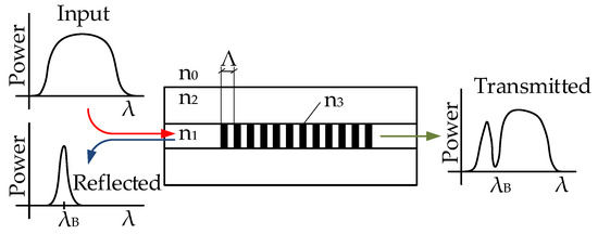 where n e f f is the effective refractive index of the FBG structure, and Λ is the period of refractive index change. The structure of the Bragg grating is shown in Figure 1. If we introduce light from a broad-spectrum radiation source into an optical fiber with FBG, then the narrow spectral region corresponding to Equation (1) is reflected, and the remaining spectral part passes through the structure.