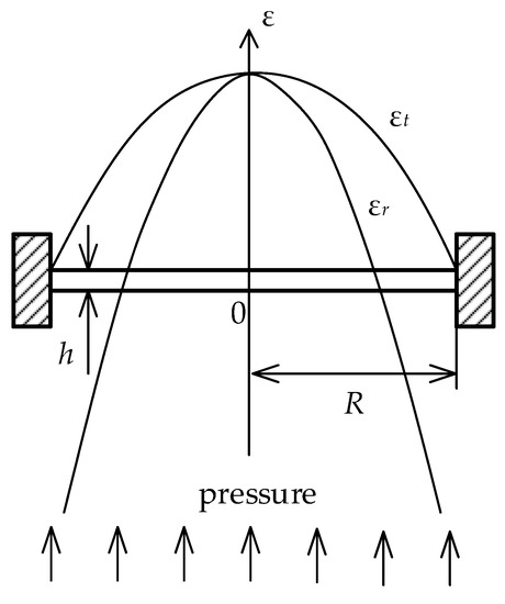 With respect to the elementary Hooke’s law, dealing with the theory of small deformations, the deflection of the membrane can be defined by a radial component ϵ r and a tangential component ϵ t . Both components have the same value in the center of the membrane that can be expressed by the equation: