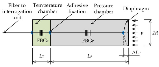 To measure pressure, the measurement of the deflection of the membrane using an optical fiber Bragg grating is used. The construction of the sensor consists of a cylinder, which is provided with a membrane on one side. This membrane cambers axially into the cylinder due to external pressure (Figure 3). The optical fiber with the Bragg grating FBG P is fixed on a moving membrane and on the other side on the base of the cylinder in the pressure chamber with length L P . When being affixed, the optical fiber is pre-tensioned so that it can be shortened during the measurement by Δ L P . The applied pressure on the membrane causes it to bend and shorten the optical fiber. As a result, the reflected Bragg wavelength shifts toward lower wavelengths. The temperature effect is compensated by the second Bragg grating FBG T , which is located in the temperature chamber.