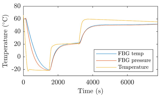 Figure 5 shows the experimental temperature measurement in the temperature box with the reference temperature sensor (orange line), the calculated temperature from F B G T , and the temperature from F B G P .