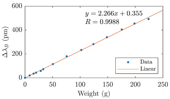 In the first phase, the membrane load was measured with weights starting at 8 g. The response of the pressure sensor, i.e., the Bragg grating monitoring the deflection of the membrane, is shown in the figure below (Figure 6). The dependence is shown up to a weight of 223 g, which represents the yield strength of a membrane made with 3D printing—see the previous chapter. When this load is exceeded, the elastic deformation changes to plastic behavior. The change of the Bragg wavelength is linearly dependent on the mass of the weight with the parameter R-square 0.9988, and the sensitivity coefficient of the pressure sensor to the weight of the diaphragm load is 2.266 pm/g.
