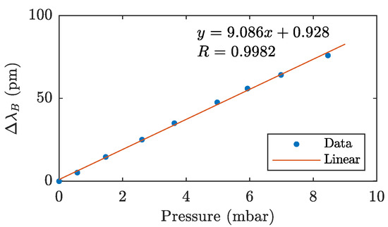 During the measurement, the pressure was increased from 0 mbar to 8.5 mbar. The measured points of the calibration curve, and thus the dependence of the change in the Bragg wavelength on the applied pressure, are shown in Figure 8. Here, data from a millimeter sensor with a sensitivity of 0.098 mbar/mm scale were used for the pressure reference value.
