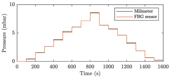 Table 1 shows the measured data from a stated pressure measurement cycle from 0 mbar to a maximum pressure of 8.526 mbar and a subsequent decrease to 0 mbar. The table shows the values measured with a column and digital pressure sensor. For the FBG sensor, the measured changes in the Bragg wavelength and converted pressure according to Equation (4) are given. The last columns show the absolute and relative error of the FBG sensor relative to the reference column pressure gauge.
