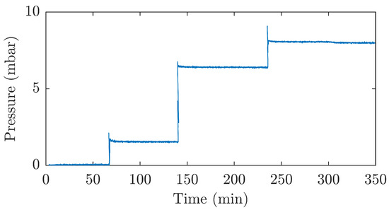 An important parameter of the designed sensor is its ability to correctly measure static or unchanging pressure over a long time interval. For this reason, measurements were made in which the sensor was loaded with a constant pressure for a long period of time. The measured data are shown in Figure 10. During the measurement, the sensor was loaded with a pressure of 1.6 mbar for 73 min, a pressure of 6.5 mbar for 94 min and, in the last step, a pressure of 8.1 mbar for 113 min.