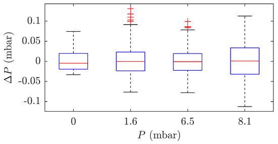 Figure 11 shows the variance of the measured data in each sensor load condition. For better visualization, the mean value is removed from the measured data. The results show that the sensor is capable of measuring static pressure with a deviation of ±0.1 mbar. In the range of 0 to 10 mbar, this represents a deviation of 10% for pressures close to 0 and 1% for pressures close to 10 mbar.