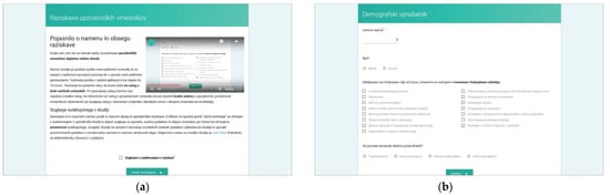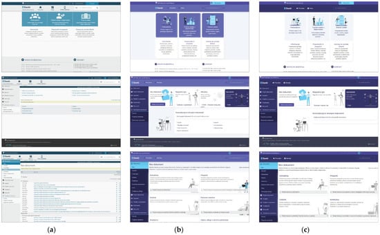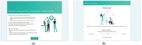 eDavki is an eGovernment portal and enables users (i.e., taxpayers) to digitally interact with the Financial Administration of the Republic of Slovenia (FURS) through two-way communication, e.g., submitting and receiving documents [], as represented in Figure 1a. The portal was introduced in 2003, and until 2018 there were no significant upgrades in terms of user experience or terminal access options. In 2018, new additions in the form of a mechanism for electronic document serving, access without the government-issued certificates for natural persons, SMS notification, an UPN payment order module, a dedicated mobile application and also some user interface upgrades were implemented. The user interface was enlivened through roughly following the overall decree and annexes on the Government’s and State Administration’s integrated graphic image []. In retrospect, it was speculated that the implementation did not completely follow an in-depth and comprehensive design strategy or system, e.g., as in the case of the United Kingdom government portals []; rather, it was a product of the assessment of the user needs and technical possibilities of the contractor responsible for the implementation. The user experience was enhanced, in addition to an overall simplification of the structure, to serve the needed information in a faster manner. Optional accessibility enhancements can also be accessed through settings. The mobile, responsive interface was implemented in the public part of the portal, and the private section introduced a unified repository for all tax forms, yet without a dedicated mobile variant of the layout.