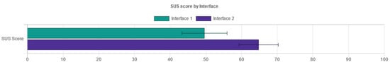 - System Usability Scale (SUS) for measuring the usability of systems []. The SUS Questionnaire is a simple and familiar tool for assessing usability, which is widely used in the context of digital systems. It includes 10 items on which the respondents indicate their agreement with the five-point Likert scale: from “I disagree completely” to “I completely agree”. The SUS includes indications of learnability (items 4 and 10) and usability (other items) []. It also encompasses effectiveness, such as the ability of the user to complete a task using the system; efficiency, as a measure of the resource usage (time and attention) in performing a task; and satisfaction, as the user’s subjective response to the use of the system [].