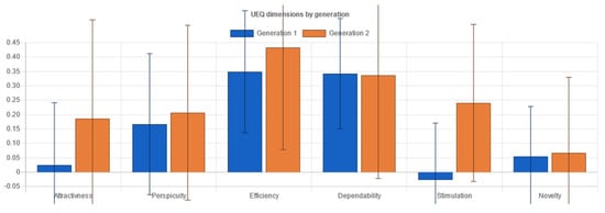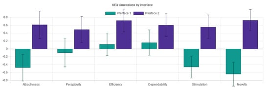 - User Experience Questionnaire (UEQ) for measuring user experience []. The User Experience Questionnaire contains six components, with a total of 26 items, marked with a 7-point Likert scale. It measures attractiveness as a general impression of a product; perspicuity, as product recognition; efficiency, as the ability to complete tasks without undue effort; dependability, as a measure of user control over the interaction; stimulation, in conjunction with excitement and motivation to use the product; and novelty if the product is innovative and creatively designed. Perspicuity, efficiency and dependability display pragmatic qualities and are goal-oriented, while stimulation and novelty are hedonic aspects. Attractiveness is a combined trait [].