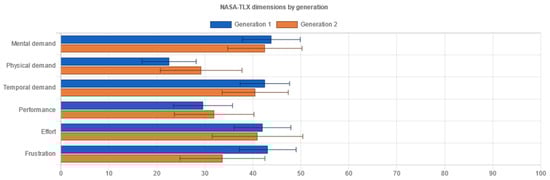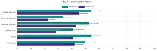 - NASA-Task Load Index (NASA TLX) for measuring subjective load rating []. The subjective workload questionnaire consists of six factors: mental demand, which measures how much mental and perceived activity was required; physical demand, measuring how much physical effort was required; temporal demand, assessing how much time pressure a participant feels when completing tasks; own performance contains an assessment of one’s own performance; effort, an overall assessment of how difficult the task was; and frustration, assessing how much non-safety, irritation, stress and disruption a participant experienced to complete the task. The three factors, mental, physical and temporal complexity, relate to the participant, whilst the auxiliary three, effort, frustration, and performance, relate to the task. Each component is represented in a rank scale of 0.100 [].