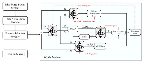 The general framework of the proposed method has been illustrated in Figure 1. As it can be observed from this figure, the proposed framework contains multiple modules including data acquisition, feature selection, kGAN, and decision making. We make use of sparse data measuring devices in order to collect voltage, frequency, and phase-angle measurements form each bus in the distributed power system. The collected data measurements are then fed into a feature selection module, in which multiple state-of-the-art techniques including InfFS, Relief, MutInfFS, and mRMR have been implemented in order to extract the most informative features from the original set of features. The extracted features are then fed into the kGAN module, where the selected features are used as input and a corresponding set of random variables called knockoffs are outputs of the module. The generated knockoffs are then fed into the decision making module, where the kNN and SVM classification models have been used in order to diagnose different types of faults.