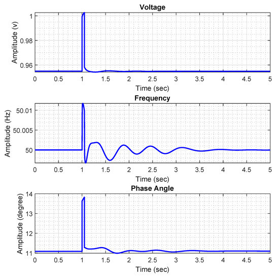 The collected voltage, frequency, and phase angle measurements following an LL fault on bus #1 at second of the simulation.
