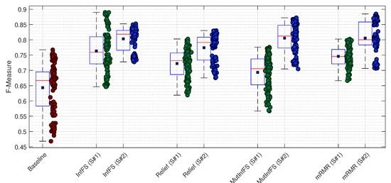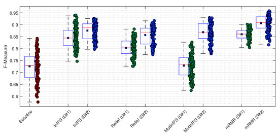 We repeat the same experiments for the SVM classification model. The attained results are represented in Figure 4. As it can be observed, the baseline shows much variation in terms of F-Measure in dealing with different datasets. However, it almost shows the same average F-Measure value in comparison with the results of the MutInfFS used in the first scenario, but lower average F-Measure values compared with the second scenario. By comparing the first and second scenarios, the attained results, on one hand, show the superiority of the second scenario for each feature selection technique. On the other hand, the second scenario leads to lower variation in F-Measure values when InfFS, Relief, and MutInfFS techniques are applied. The attained results for the SVM classification model are summarized in Table 2.