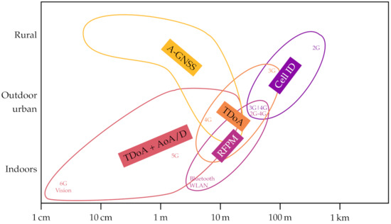 The Universal Mobile Telecommunications Service (UMTS) and Long-Term Evolution-Advanced (LTE-A) included the estimation of times of arrival and powers of downlink and uplink signals, which can be used to improve the localization precision below 100 m. Radio frequency pattern matching (RFPM) techniques can further push the limit down to about 50 m. RFPM is based on a) collecting radio channels for given UE positions and b) matching the channel of a UE to the collected database. With time difference of arrival (TDoA) techniques, instead, the times of arrival of downlink or uplink signals provide the differences of distances between the UE and several gNBs, which are then used for trilateration. Thanks to more refined pilot signals and larger bandwidths, TDoA methods reduced location uncertainty from about 100 m in UMTS to a few tens of meters in LTE-A [15].