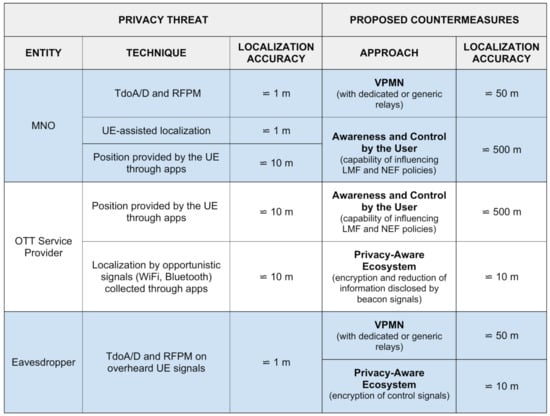 As outlined, various entities may access the UE location information in 5G networks: the MNO, the OTT service providers and eavesdroppers. All these entities may improperly use the UE location information. Moreover, we have highlighted the main points in the 5G network from which location information can be obtained: the wireless channel (for an eavesdropper); the NG-RAN, NWDAF, and LMF (for the MNO); and the NEF (for OTT providers). Location privacy should be protected at all these points and against all the entities.