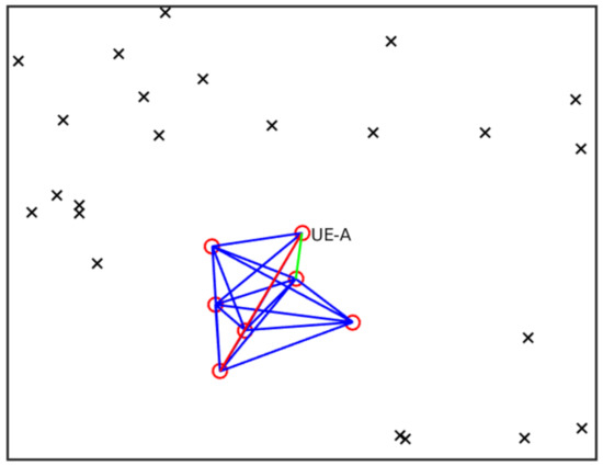 Example VPMN layout. Red circles: UEs of the VPMN. Crosses: other UEs. Green line: minimum distance between UE-A and any other UE in the VPMN. Red line: maximum distance between UE-A and any other UE in the VPMN.