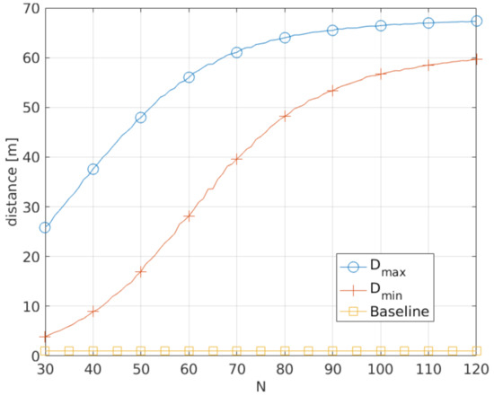 Average maximum and minimum obfuscation distance for UE-A, as a function of the number of UEs N in the considered area. N UEs are uniformly randomly dropped in an area of 100 m × 100 m. UE-A is at the center of the square area and only UE closer than 15 m communicate directly. The baseline is a distance of 1 m, indicating the position accuracy in the absence of a VPMN.