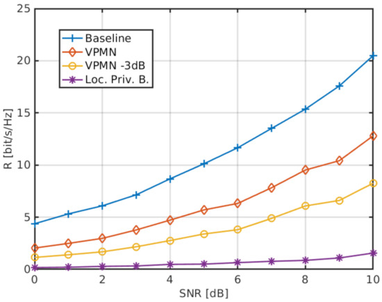 Average achievable rate obtained by the baseline system (no privacy constraints), by the VPMN (with/without 3dB attenuation), and by the location-privacy beamforming of [27], as a function of the average SNR. UEs are equipped with antennas, UE-A is located at position (0,0), the gNB (with 65 antennas) at (4,0), and UE-B at position (2,2).