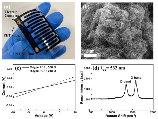 (a) CNT film printed on a PET substrate, (b) FE-SEM image of PCF surface, (c) I-V test results of C-Type and R-type PCFs, and (d) Raman spectra of PCF.