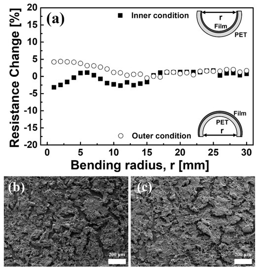 Figure 2 shows the mechanical properties of PCF. Generally, bending and adhesion (so-called ‘Scotch tape test’) tests are carried out for the application of films on flexible substrates [18]. Figure 2a shows the resistance change with respect to the change of the bending radius. During the bending test within a radius from 0 to 30 mm in both inner and outer directions, the PCF shows a small resistance change (<4.3%). It is comparable with the previous result. Saran et al. [19] have reported a small resistance change of <3% from a bending test of 35 μm thick CNT film. Figure 2b,c reveal the before and after test FE-SEM images of PCF. Considerable change in morphology was not observed by the test.