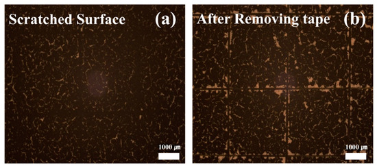 (a) Scratched surface of PCF and (b) PCF surface after removing the scotch tape. Note that the adhesion of PCF is evaluated through the peeled area of the surface.