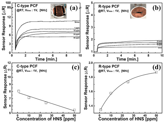 After investigating the mechanical strength of the PCF, the sensing properties of the PCF was observed. Figure 4 shows the response of each sensor. A chemical solution was applied, prepared by mixing salt-water (3.5wt % NaCl) and NH3 (99%, NH4OH). Note that OSHA has specified a PEL of NH3 as 25 ppm. Hence, we performed the experiment in the range of 1~50 ppm. Figure 4a,b show the response of both C-type and R-type PCF sensors, in which the inset of each figure is a photograph of the corresponding sensor. A resistance change according to the NH3 concentration was clearly observed. Figure 4c,d shows the concentration dependency of sensor response. From the results of Figure 4, sensor performances at room temperature such as sensitivity, LOD, response time, and linearity were summarized in Table 2, although the sensing performance of the PCF sensor was not optimized yet.