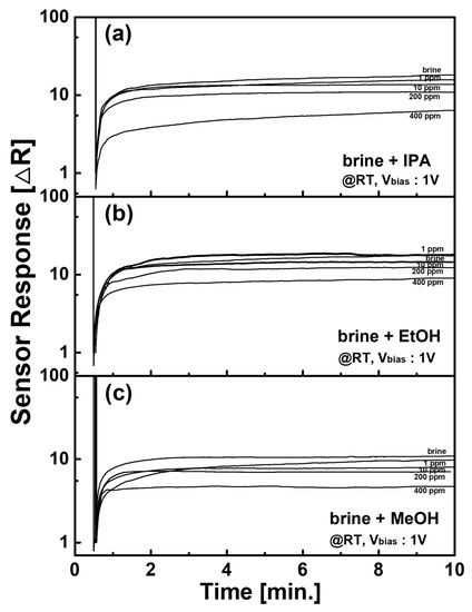 Temporal response of C-type PCF sensor against (a) IPA, (b) EtOH, and (c) MeOH in brine.