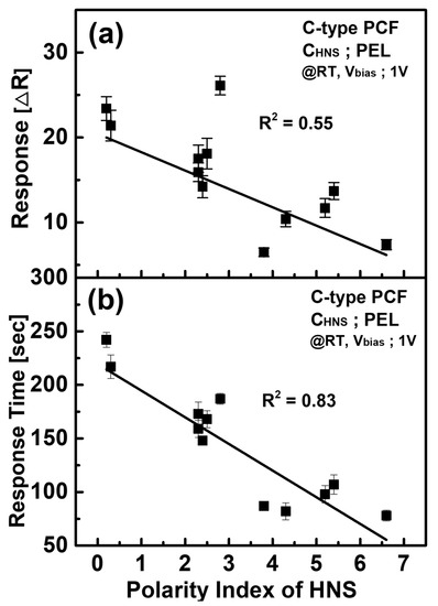 It is well known that not only high sensitivity but also the selectivity of the sensor is an important factor for the development of sensors. The correlation between the response of the sensor and the physical properties of HNS has been considered, as shown in Figure 7. Figure 7a shows the correlation between the sensor responses and the polarity index of HNS. The coefficient of determination (R2) from a linear fitting was as low as 0.55. Figure 7b shows the correlation between response time and polarity index. In this case, R2 was 0.83, which indicates that response time is more strongly correlated with the polarity index. Moreover, note that non-polar HNS showed a longer response time (>140 s), while polar HNSs revealed a shorter response time (<110 s). It can be explained in terms of the difference in the diffusion coefficients of each HNS [29,30]. It is interesting to note that the risk index of non-polar HNS is generally higher than that of polar HNS [16]; hence, one could use the difference response time as a guide of warning high-risk HNS. Murad reported that external electric fields on the ion mobility, drift velocity, and drift–diffusion rate of ions. In our experiment, the external field was fixed to 1 V, and the effect of the field is much less dramatic in water than the ions; hence, ionic concentration will dominate the drift velocity and diffusion rate [31].