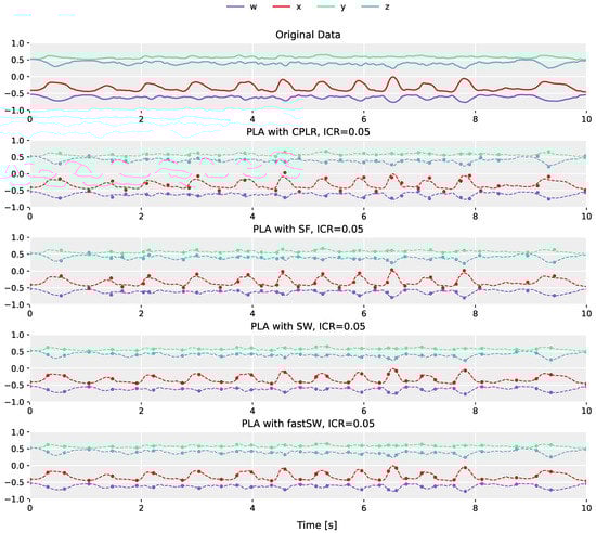 The differences in segment point construction between regression-based PLA algorithms (e.g., CPLR and SF), and PLA algorithms that produce segment points that are a subset of the original sensor data (e.g., SW), is demonstrated in Figure 2. The plot in the top row shows the original orientation data obtained from the left shank of the fast-paced running on spot activity of user MR from the TNT15 dataset. The following plots below (from top to bottom) depict the corresponding PLAs produced by CPLR, SF, SW, and our proposed method (fastSW) at a similar inverse compression ratio of approximately 5%. For the sake of comparison, PLAs are depicted as point markers overlaid over the original sensor data represented by dashed lines. The segment points of CPLR and SF do not lie on the original data, except by chance. When approximated by SW (or fastSW), segment points are guaranteed to lie on the original data, since SW selects a subset of the original signal values as its segmentation points. This will be explained in more detail in Section 5.