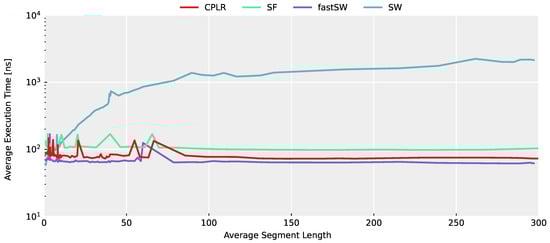 Average execution time per sample plotted against the resulting average segment length of each PLA algorithm applied to the entire TNT15 dataset at a high range of threshold values on an x86_64 architecture. For the sake of comparison, the execution time is plotted in a logarithmic scale. CPLR, SF, and fastSW show a constant execution time, while SW shows a linear average execution time, with respect to the average segment length.