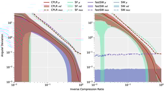 Left: Average (solid line), standard deviation (shaded area), and maximum (dashed line) of angular deviations of the approximations of the entire TNT15 dataset with CPLR, SF, SW, and fastSW from the original signal after interpolating the produced segment points using spherical linear interpolation (SLERP). Right: Average, standard deviation, and maximum of angular deviations of only the segments points of the same approximations. Values are plotted against the resulting inverse compression ratio (ICR) at a high range of different threshold values. Colors of the shaded regions denoting the standard deviations mix up and may extend over the whole plot at smaller ICRs due to the logarithmic scale of the y-axis. While differences of the methods on the reconstructed signal (left plot) are not obvious, the differences of the segment points themselves (right plot) are significant. CPLR and SF show increasing angular deviations of their segment points with decreasing ICR. The segment points of SW and fastSW, on the other hand, are not affected by the ICR and show constant angular deviations at a small scale caused by numerical precision.