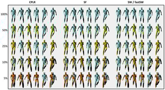 For the sake of demonstration, the reconstruction results of the running on spot activity of user MR from the TNT15 dataset at six different frames and five different compression ratios are depicted in Figure 5 for CPLR, SF, SW, and fastSW. The frames have been interpolated from the segment points using SLERP. Although the focus of the paper at hand is not particularly on animation or motion reconstruction but rather on motion capturing with orientation sensors, the reconstructed animations in Figure 5 provide a good visual feedback on the trade-off between approximation error and compression ratio.