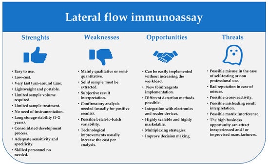 The LFIA can be considered as a sort of lab-in-a-hand and together with other PON tests has represented a paradigm shift from sample-to-lab to lab-to-sample aiming to improve decision making and turnaround time [4]. The very attractive features of LFIA have driven to reach a wide acceptance and appeal of this technique (the main LFIA features are reported in Figure 1). Therefore, from the detection of hormones, parasites, bacteria, cells, viruses, biological markers for clinical purposes, the LFIA application has been rapidly extended to other fields, including food and feed safety, veterinary medicine, environmental control, forensic analysis, and many others [12,13,14].