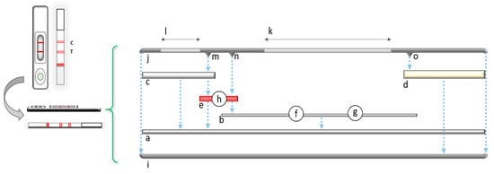The structure of a typical LFIA strip. (a) backing support, (b) nitrocellulose porous membrane (c) sample pad, (d) absorbent pad, (e) conjugate pad, (f,g) immunoreagents areas, (h) labelled immunoreagent, (i,j) cassette, (k) reading window, (l) sample well, (m–o) pressure points.