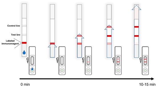 The LFIA starts by applying the liquid sample on the sample pad (Figure 3). The solution resuspends the labelled immunoreagents from the conjugate pad and the analytes and the labelled probe flow by capillary forces along the membrane and through the lines, where immunoreactions take place [14]. Usually, they do not require external reagents for completing the assay besides the liquid sample. Results are quick and easy to interpret, usually without the help of equipment for qualitative assays [4]. In addition, as discussed in Section 7, “Evergreen and new challenges”, the use of reader devices allows to obtain also semiquantitative results, avoiding the subjective results interpretation.