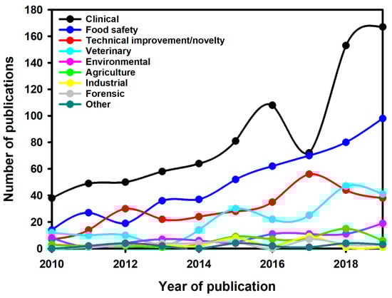 Interestingly, in the 10-year period, the food safety application showed the highest growth with a CAGR of 21%, while clinical application grew at a CAGR of 16%, followed by veterinary (13%) and environmental (9%). Clinical application most likely will reach and overcome again the growth of food application in 2020–2021 due to the COVID-19 pandemic and the related LFIA developed to detect the viral antigens or the antibodies against them. In the same period, the efforts of researchers to enhance the LFIA technique can be highlighted from the 18% CAGR of articles publication regarding technical improvements.